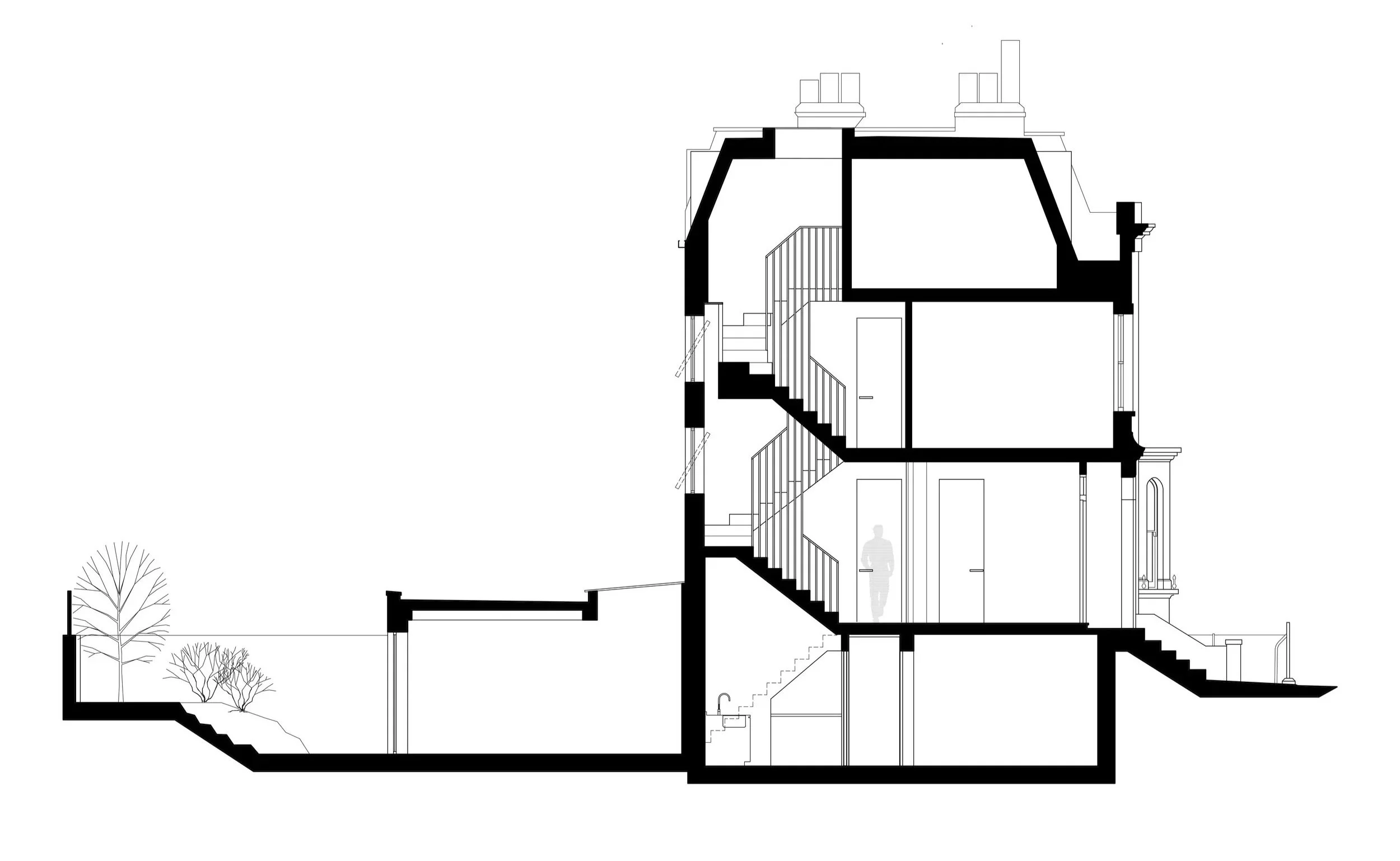 The chosen solution was to excavate the rear garden, underpinning and damp proofing the party walls to extend the lower ground floor into half of it, with the remaining half a sunken external terrace. The planning authority accepted the scale of this new addition due to its partially subterranean form, reducing its bulk when viewed from the gardens of the adjoining properties.