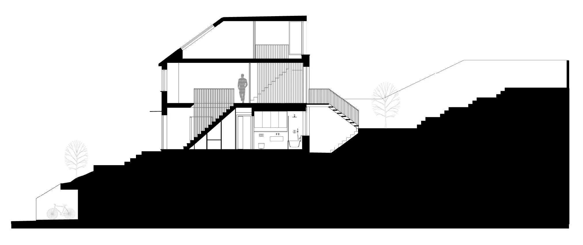The front garden was relandscaped, permitting a more gradual stepped approach to the front door from the pavement, with a slender handrail. Several tons of top soil were added to raise levels around the stair, and native tree planting introduced in the form of coppiced silver birch and rowan to provide wind shelter and soften the view of the house from below. At pavement level a subterranean store was designed with a cranked sliding door to follow the topography of the garden whilst providing sufficient head height for full internal access. It is vital to the functioning of the home for a young, active family with bikes and baby buggies, avoiding the need to lug these items up and down the front steps, whilst also permitting bins to be removed from the pavement