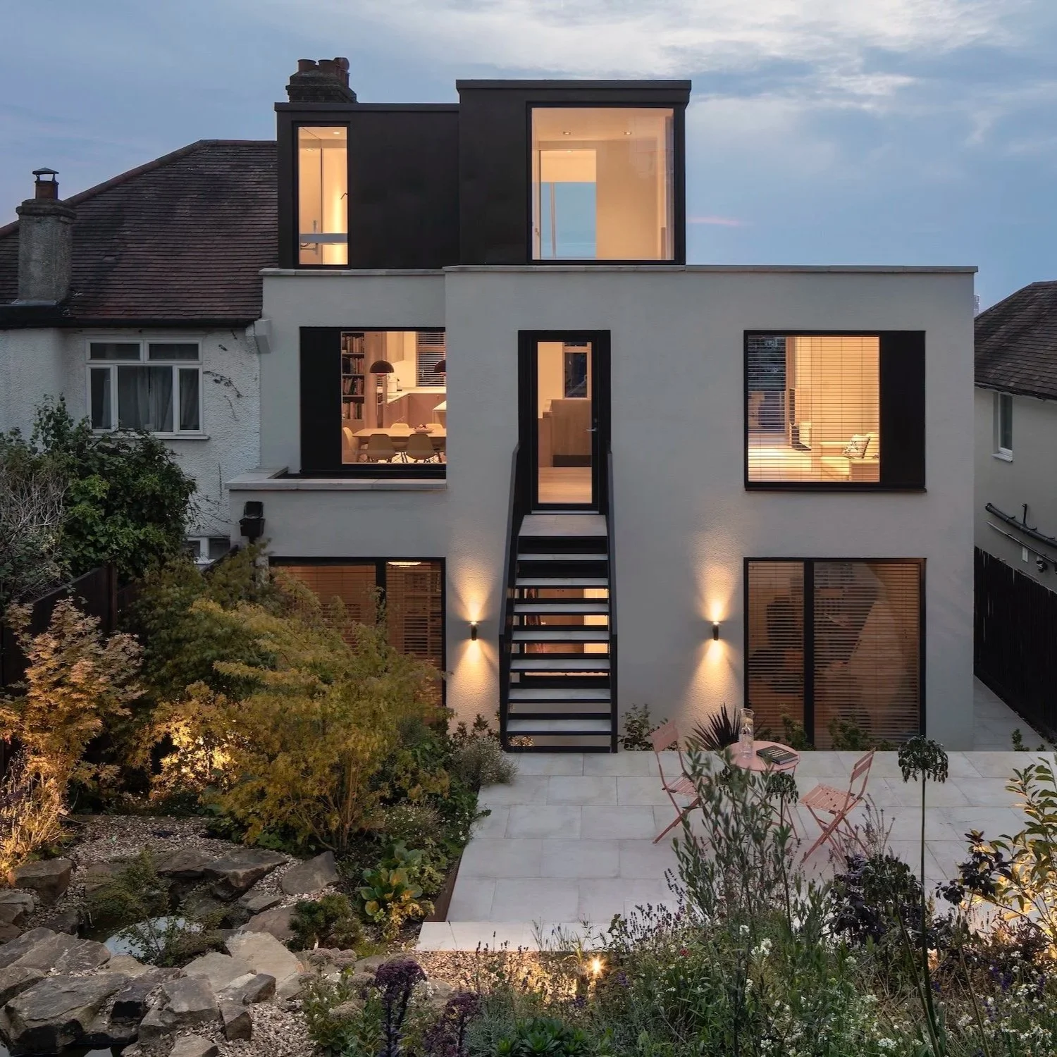 The existing frontage of the house was restored to its original appearance, with small paned timber casement windows. The other elevations have much larger square windows, to exploit spectacular views across central London and the rear garden. Dark metal cladding is also utilised to recess the new side and roof extensions from the main house. The textured render treatment of the original house is extended across the other new walls, to unify the composition.
